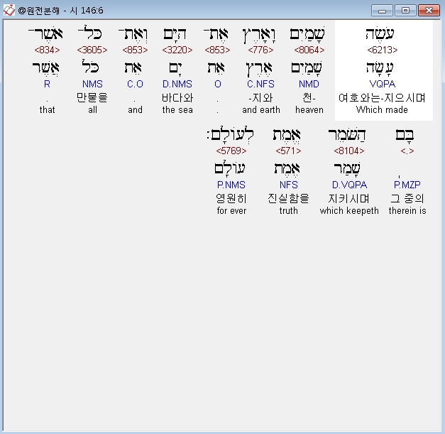 히브리어구약BHS,6 עֹשֶׂה שָׁמַיִם וָאָרֶץ אֶת־הַיָּם וְאֶת־כָּל־אֲשֶׁר־בָּם הַשֹּׁמֵר אֱמֶת לְעֹולָם׃