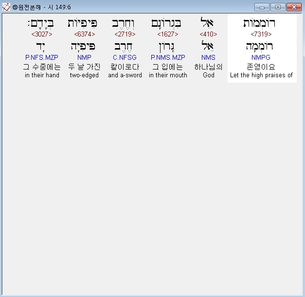 히브리어구약BHS,6 רֹומְמֹות אֵל בִּגְרֹונָם וְחֶרֶב פִּיפִיֹּות בְּיָדָם׃
