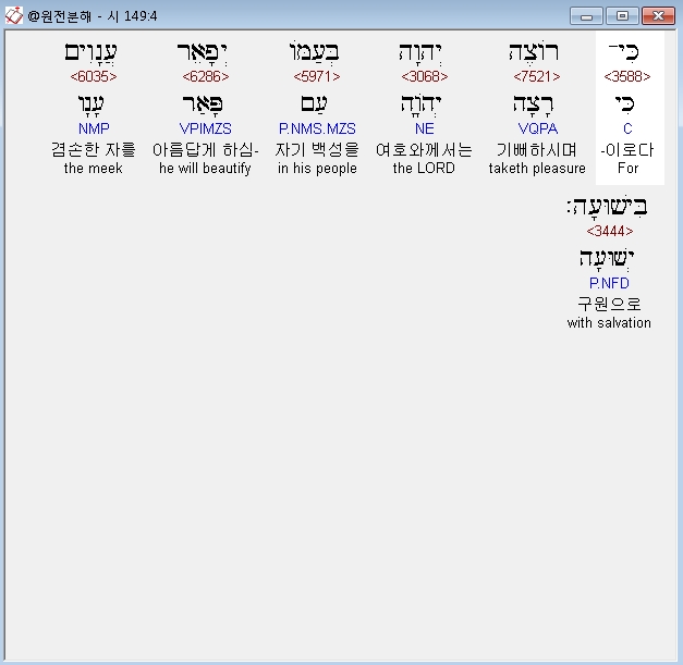 히브리어구약BHS,4 כִּי־רֹוצֶה יְהוָה בְּעַמֹּו יְפָאֵר עֲנָוִים בִּישׁוּעָה׃