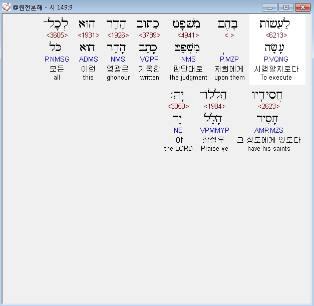히브리어구약BHS,9 לַעֲשֹׂות בָּהֶם מִשְׁפָּט כָּתוּב הָדָר הוּא לְכָל־חֲסִידָיו הַלְלוּ־יָהּ׃