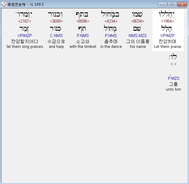 히브리어구약BHS,3 יְהַלְלוּ שְׁמֹו בְמָחֹול בְּתֹף וְכִנֹּור יְזַמְּרוּ־לֹו׃