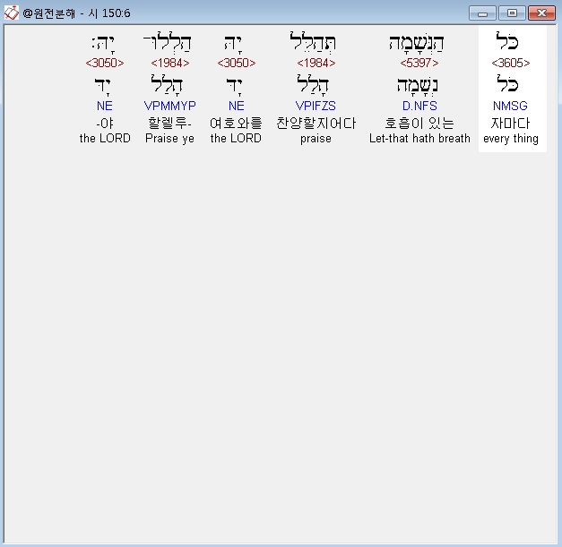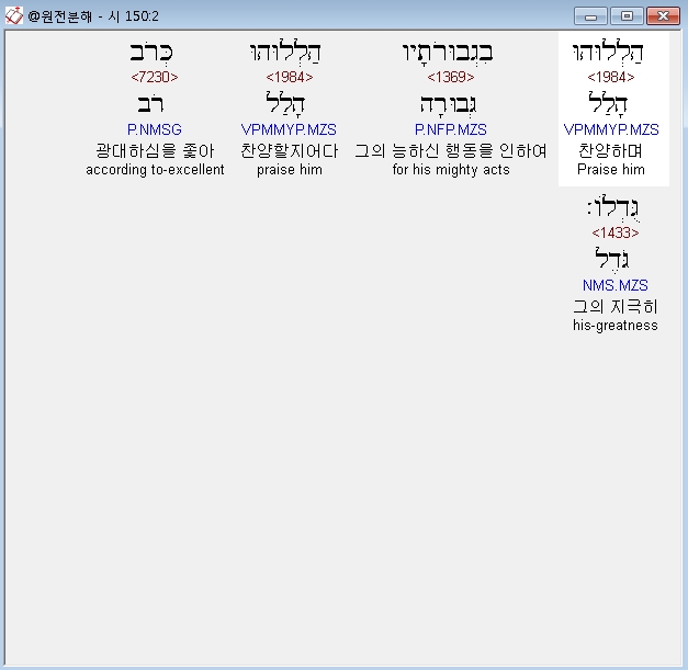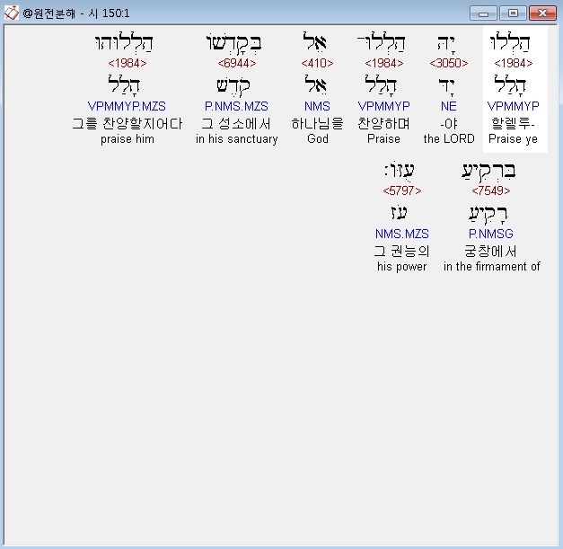 | 히브리어 시편 148편 전체 원어 원문 성경 공부 주석 강해 설교 해설 해석 (0) | 2020.10.15 |