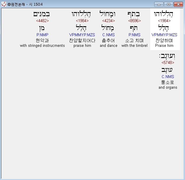 | 히브리어 시편 149편 전체 원어 원문 성경 공부 주석 강해 설교 해설 해석 (0) | 2020.10.15 |