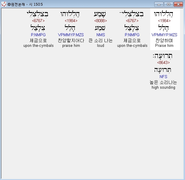 히브리어구약BHS,5 הַלְלוּהוּ בְצִלְצְלֵי־שָׁמַע הַלְלוּהוּ בְּצִלְצְלֵי תְרוּעָה׃