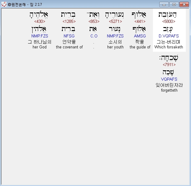 히브리어구약BHS,17 הַעֹזֶבֶת אַלּוּף נְעוּרֶיהָ וְאֶת־בְּרִית אֱלֹהֶיהָ שָׁכֵחָה׃