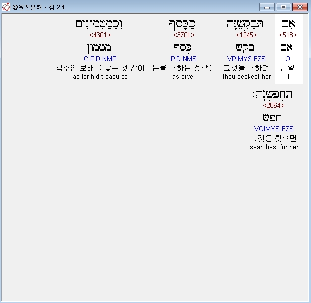 히브리어구약BHS,4 אִם־תְּבַקְשֶׁנָּה כַכָּסֶף וְכַמַּטְמֹונִים תַּחְפְּשֶׂנָּה׃