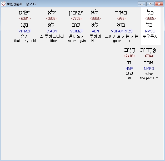 히브리어구약BHS,19 כָּל־בָּאֶיהָ לֹא יְשׁוּבוּן וְלֹא־יַשִּׂיגוּ אָרְחֹות חַיִּים׃