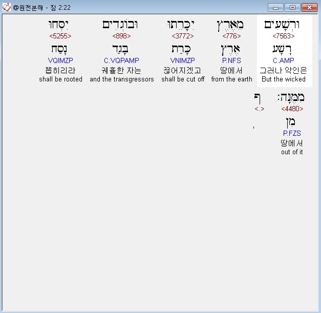 히브리어구약BHS,22 וּרְשָׁעִים מֵאֶרֶץ יִכָּרֵתוּ וּבֹוגְדִים יִסְּחוּ מִמֶּנָּה׃ ף