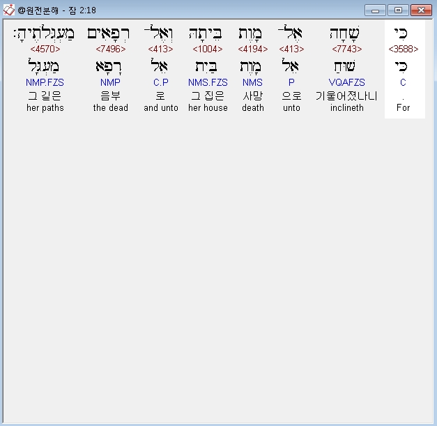 히브리어구약BHS,18 כִּי שָׁחָה אֶל־מָוֶת בֵּיתָהּ וְאֶל־רְפָאִים מַעְגְּלֹתֶיהָ׃