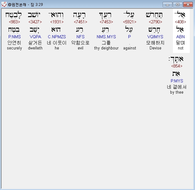 히브리어구약BHS,29 אַל־תַּחֲרֹשׁ עַל־רֵעֲךָ רָעָה וְהוּא־יֹושֵׁב לָבֶטַח אִתָּךְ׃