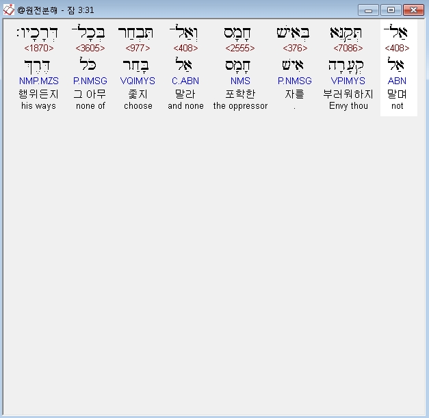 히브리어구약BHS,31 אַל־תְּקַנֵּא בְּאִישׁ חָמָס וְאַל־תִּבְחַר בְּכָל־דְּרָכָיו׃