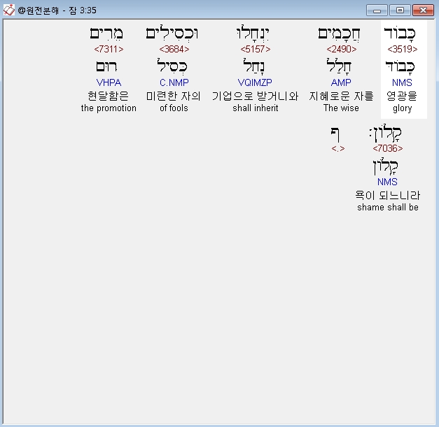 히브리어구약BHS,35 כָּבֹוד חֲכָמִים יִנְחָלוּ וּכְסִילִים מֵרִים קָלֹון׃ ף