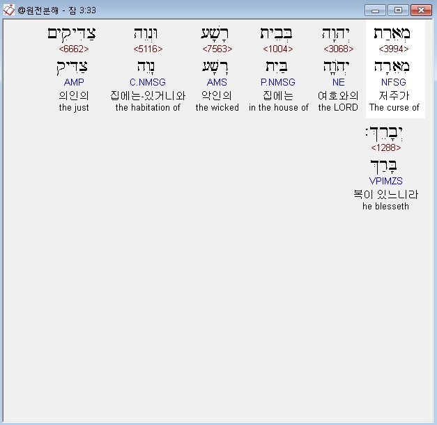 히브리어구약BHS,33 מְאֵרַת יְהוָה בְּבֵית רָשָׁע וּנְוֵה צַדִּיקִים יְבָרֵךְ׃