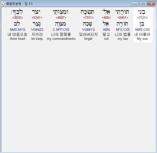 히브리어구약BHS,1 בְּנִי תֹּורָתִי אַל־תִּשְׁכָּח וּמִצְוֹתַי יִצֹּר לִבֶּךָ׃