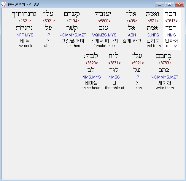 히브리어구약BHS,3 חֶסֶד וֶאֱמֶת אַל־יַעַזְבֻךָ קָשְׁרֵם עַל־גַּרְגְּרֹותֶיךָ כָּתְבֵם עַל־לוּחַ לִבֶּךָ׃