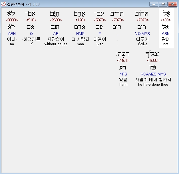 히브리어구약BHS,30 אַל־[כ= תָּרֹוב] [ק= תָּרִיב] עִם־אָדָם חִנָּם אִם־לֹא גְמָלְךָ רָעָה׃