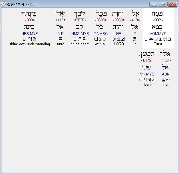 히브리어구약BHS,5 בְּטַח אֶל־יְהוָה בְּכָל־לִבֶּךָ וְאֶל־בִּינָתְךָ אַל־תִּשָּׁעֵן׃