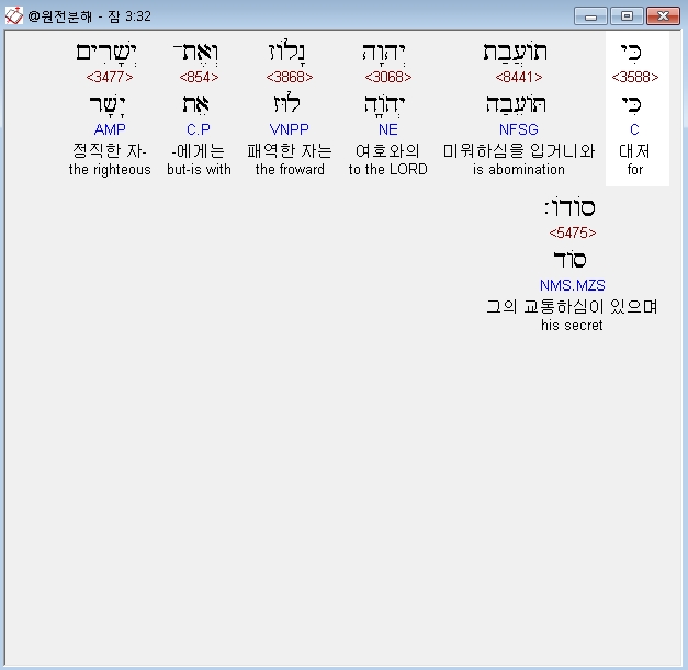 히브리어구약BHS,32 כִּי תֹועֲבַת יְהוָה נָלֹוז וְאֶת־יְשָׁרִים סֹודֹו׃