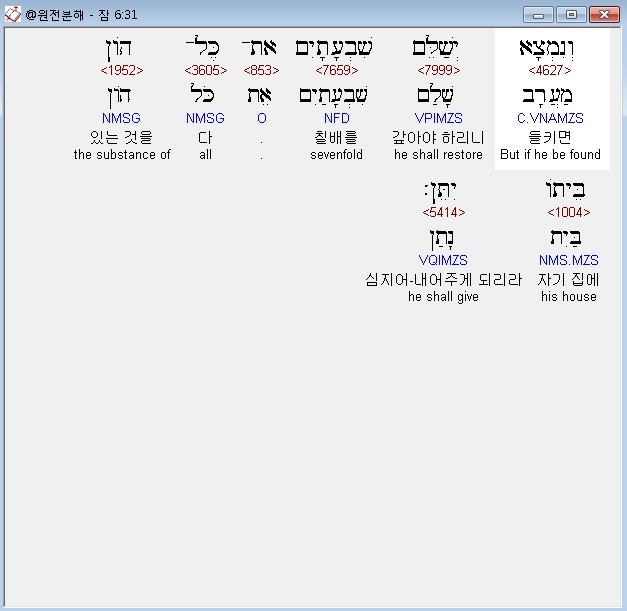 히브리어구약BHS,31 וְנִמְצָא יְשַׁלֵּם שִׁבְעָתָיִם אֶת־כָּל־הֹון בֵּיתֹו יִתֵּן׃