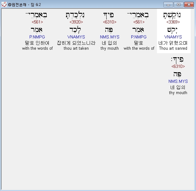 히브리어구약BHS,2 נֹוקַשְׁתָּ בְאִמְרֵי־פִיךָ נִלְכַּדְתָּ בְּאִמְרֵי־פִיךָ׃