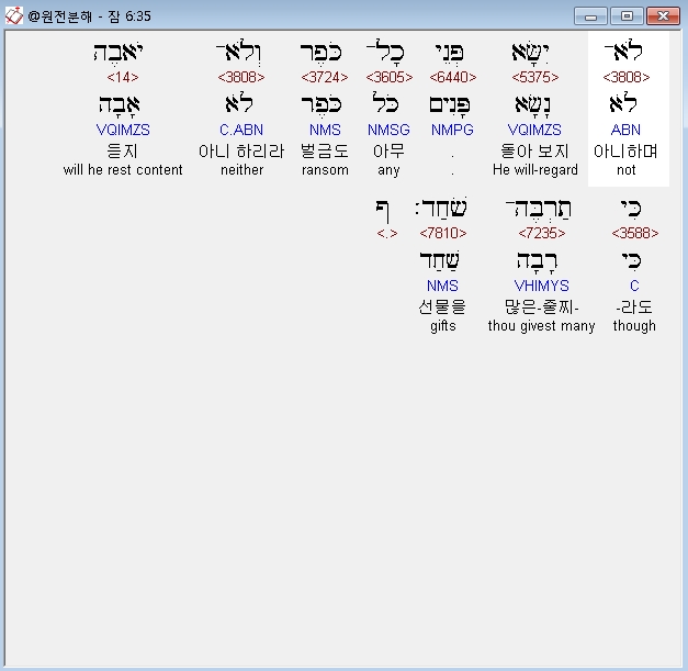 히브리어구약BHS,34 כִּי־קִנְאָה חֲמַת־גָּבֶר וְלֹא־יַחְמֹול בְּיֹום נָקָם׃