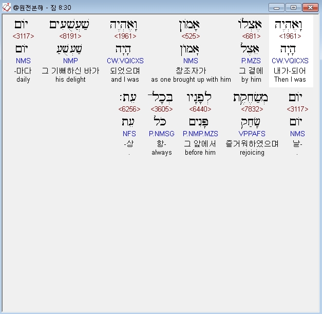 히브리어구약BHS,30 וָאֶהְיֶה אֶצְלֹו אָמֹון וָאֶהְיֶה שַׁעֲשֻׁעִים יֹום יֹום מְשַׂחֶקֶת לְפָנָיו בְּכָל־עֵת׃