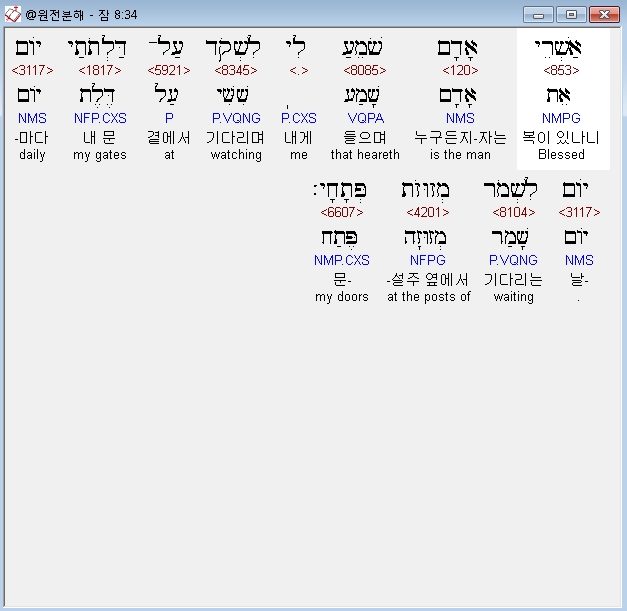 헬라어구약Septuagint,34 μακαριος ανηρ ος εισακουσεται μου και ανθρωπος ος τας εμας οδους φυλαξει αγρυπνων επ' εμαις θυραις καθ' ημεραν τηρων σταθμους εμων εισοδων