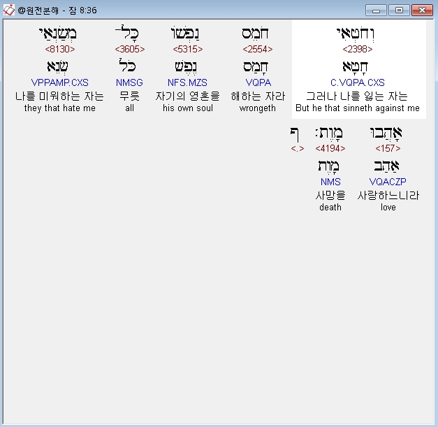 헬라어구약Septuagint,36 οι δε εις εμε αμαρτανοντες ασεβουσιν τας εαυτων ψυχας και οι μισουντες με αγαπωσιν θανατον