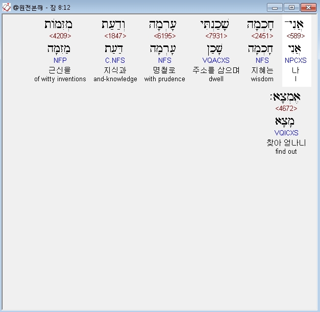 | 히브리어 잠언 9장 전체 원어 원문 성경 공부 주석 강해 설교 해설 해석 (0) | 2020.10.15 |