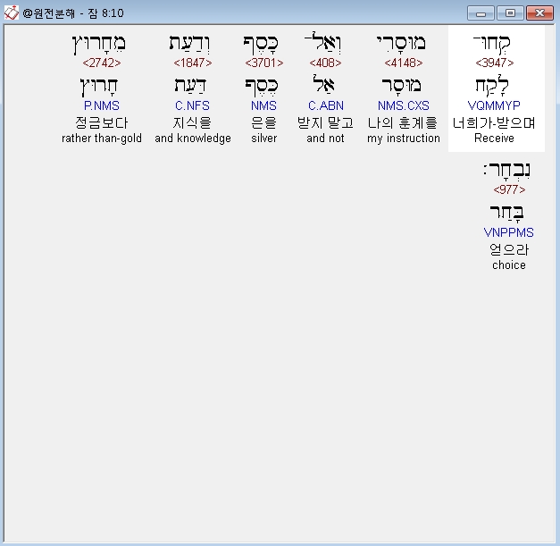 | 히브리어 잠언 10장 전체 원어 원문 성경 공부 주석 강해 설교 해설 해석 (0) | 2020.10.15 |