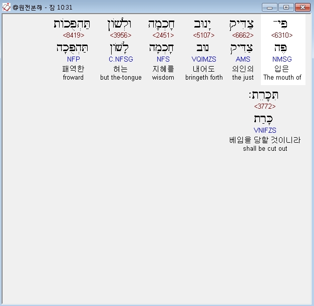 히브리어구약BHS,31 פִּי־צַדִּיק יָנוּב חָכְמָה וּלְשֹׁון תַּהְפֻּכֹות תִּכָּרֵת׃