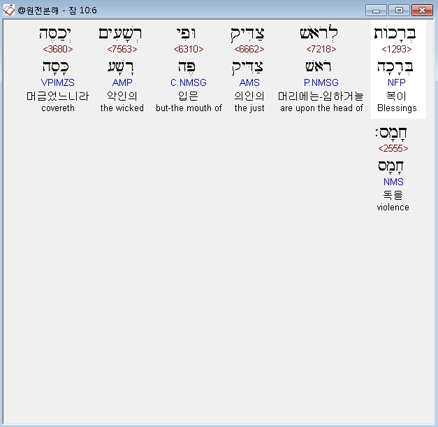 히브리어구약BHS,6 בְּרָכֹות לְרֹאשׁ צַדִּיק וּפִי רְשָׁעִים יְכַסֶּה חָמָס׃