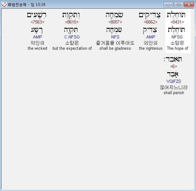 히브리어구약BHS,28 תֹּוחֶלֶת צַדִּיקִים שִׂמְחָה וְתִקְוַת רְשָׁעִים תֹּאבֵד׃