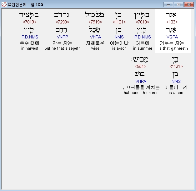 히브리어구약BHS,5 אֹגֵר בַּקַּיִץ בֵּן מַשְׂכִּיל נִרְדָּם בַּקָּצִיר בֵּן מֵבִישׁ׃