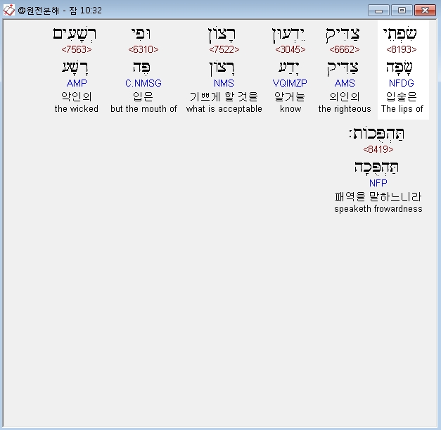 히브리어구약BHS,32 שִׂפְתֵי צַדִּיק יֵדְעוּן רָצֹון וּפִי רְשָׁעִים תַּהְפֻּכֹות׃