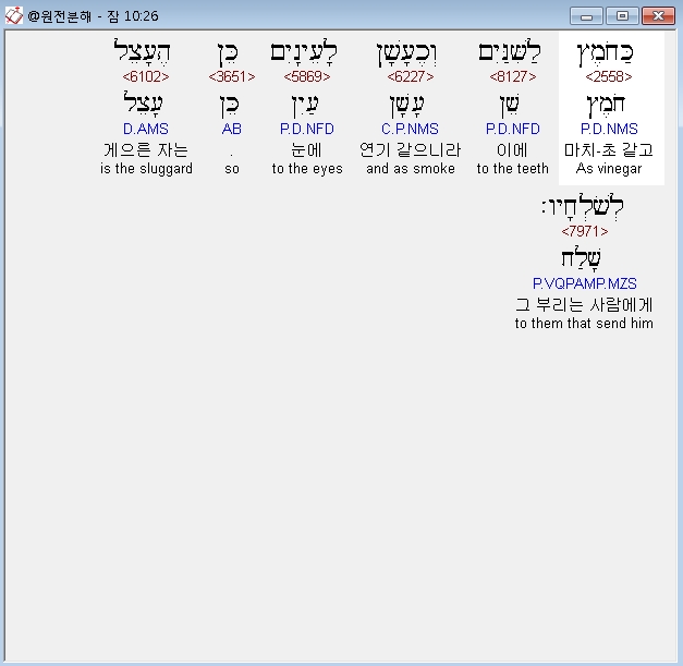 히브리어구약BHS,26 כַּחֹמֶץ לַשִּׁנַּיִם וְכֶעָשָׁן לָעֵינָיִם כֵּן הֶעָצֵל לְשֹׁלְחָיו׃