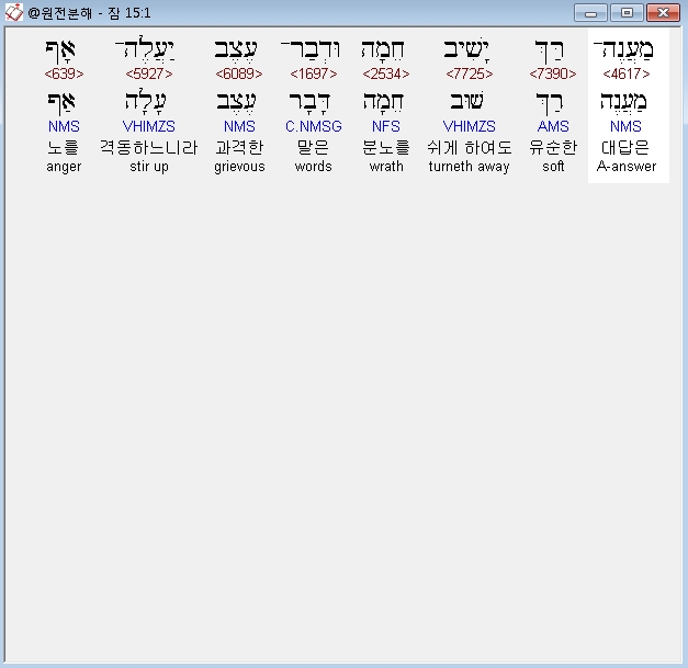 히브리어구약BHS,1 מַעֲנֶה־רַּךְ יָשִׁיב חֵמָה וּדְבַר־עֶצֶב יַעֲלֶה־אָף׃