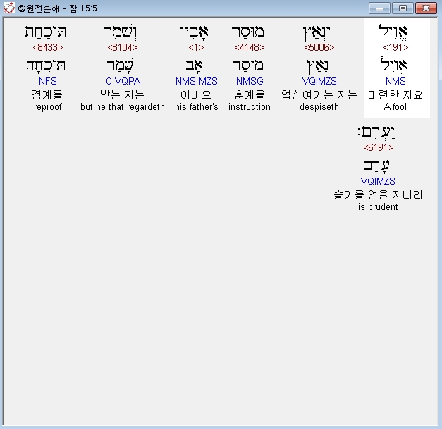 히브리어구약BHS,5 אֱוִיל יִנְאַץ מוּסַר אָבִיו וְשֹׁמֵר תֹּוכַחַת יַעְרִם׃