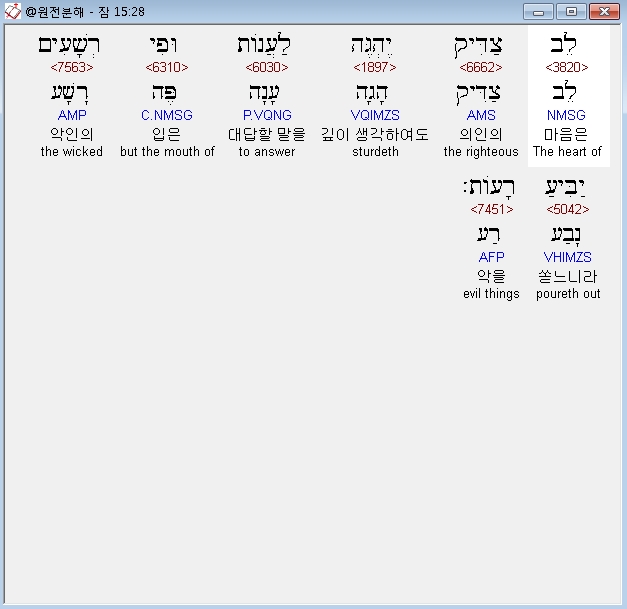 히브리어구약BHS,28 לֵב צַדִּיק יֶהְגֶּה לַעֲנֹות וּפִי רְשָׁעִים יַבִּיעַ רָעֹות׃
