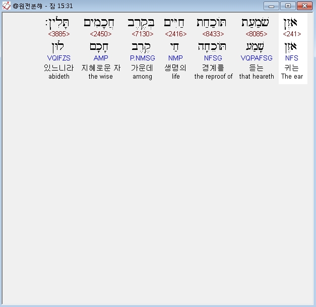 히브리어구약BHS,31 אֹזֶן שֹׁמַעַת תֹּוכַחַת חַיִּים בְּקֶרֶב חֲכָמִים תָּלִין׃