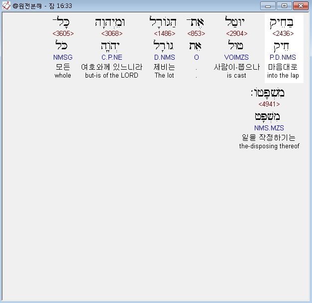 히브리어구약BHS,33 בַּחֵיק יוּטַל אֶת־הַגֹּורָל וּמֵיְהוָה כָּל־מִשְׁפָּטֹו׃