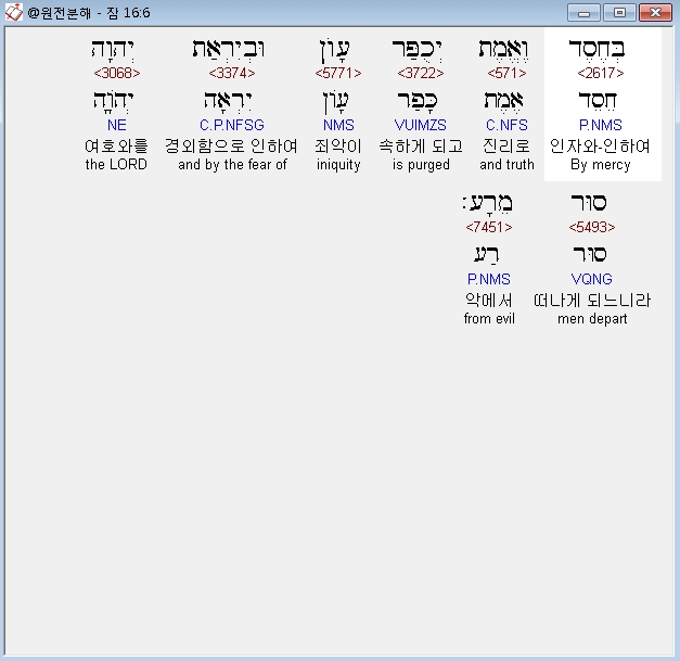 히브리어구약BHS,6 בְּחֶסֶד וֶאֱמֶת יְכֻפַּר עָוֹן וּבְיִרְאַת יְהוָה סוּר מֵרָע׃
