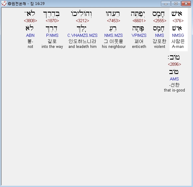 히브리어구약BHS,29 אִישׁ חָמָס יְפַתֶּה רֵעֵהוּ וְהֹולִיכֹו בְּדֶרֶךְ לֹא־טֹוב׃