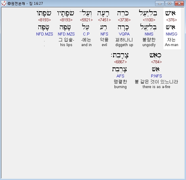 히브리어구약BHS,27 אִישׁ בְּלִיַּעַל כֹּרֶה רָעָה וְעַל־[כ= שְׂפָתָיו] [ק= שְׂפָתֹו] כְּאֵשׁ צָרָבֶת׃