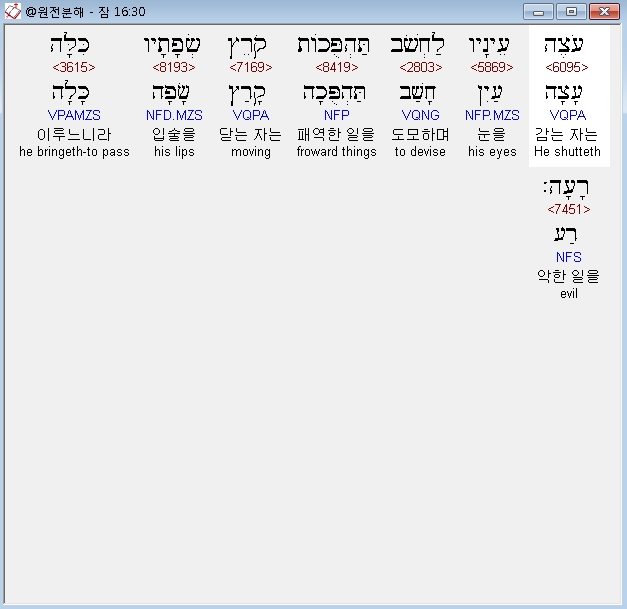 히브리어구약BHS,30 עֹצֶה עֵינָיו לַחְשֹׁב תַּהְפֻּכֹות קֹרֵץ שְׂפָתָיו כִּלָּה רָעָה׃