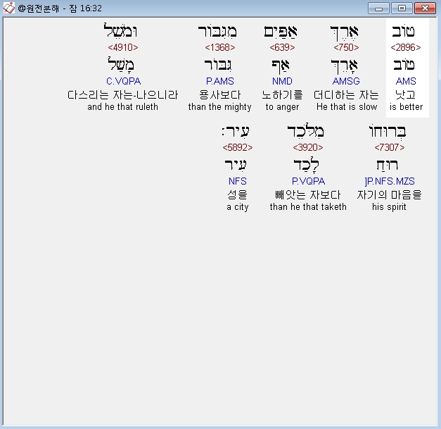 히브리어구약BHS,32 טֹוב אֶרֶךְ אַפַּיִם מִגִּבֹּור וּמֹשֵׁל בְּרוּחֹו מִלֹּכֵד עִיר׃