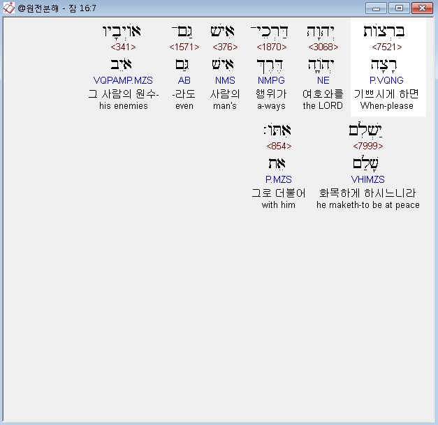 우리말성경,7 사람의 행위가 여호와를 기쁘시게 하면 원수들까지도 그와 화평하게 지낼 수 있게 하신다.