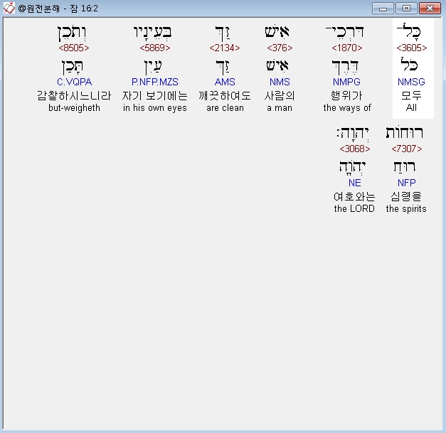 히브리어구약BHS,2 כָּל־דַּרְכֵי־אִישׁ זַךְ בְּעֵינָיו וְתֹכֵן רוּחֹות יְהוָה׃