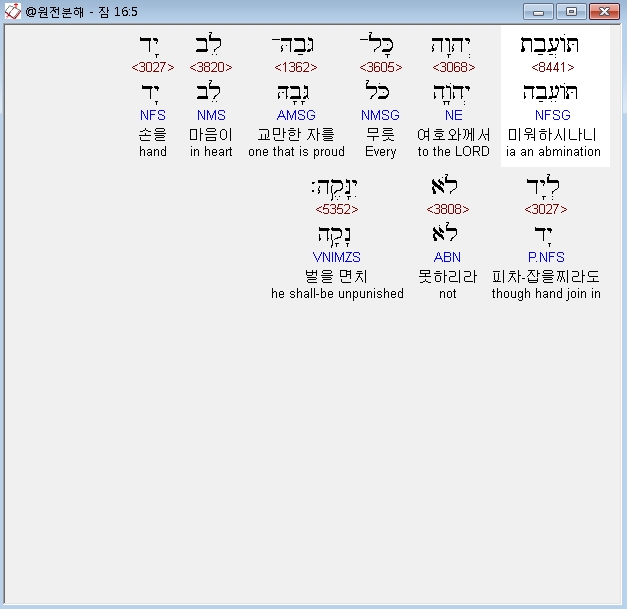 히브리어구약BHS,5 תֹּועֲבַת יְהוָה כָּל־גְּבַהּ־לֵב יָד לְיָד לֹא יִנָּקֶה׃