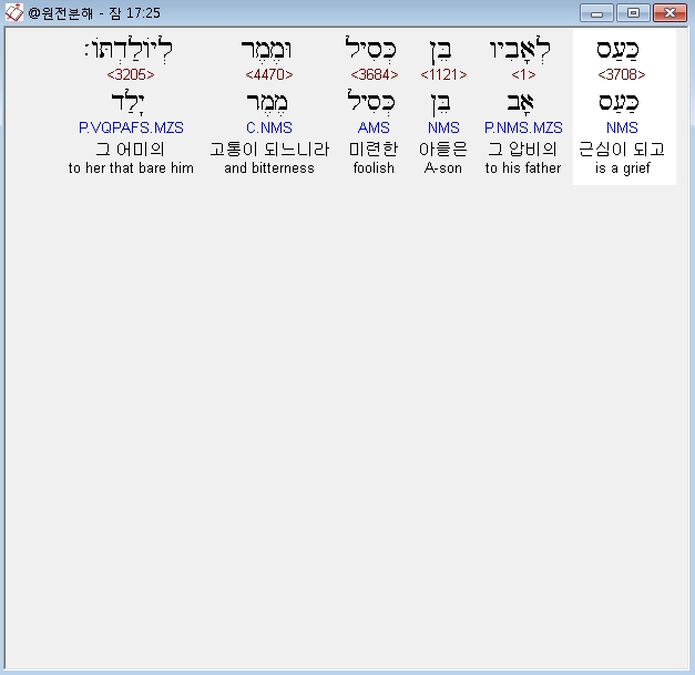 히브리어구약BHS,25 כַּעַס לְאָבִיו בֵּן כְּסִיל וּמֶמֶר לְיֹולַדְתֹּו׃